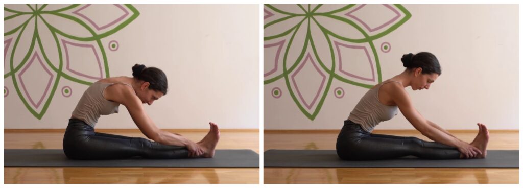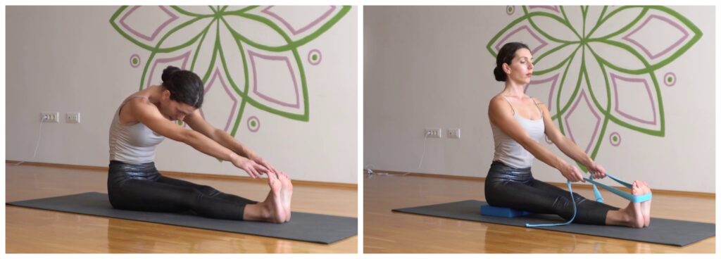 ROUNDED BACK – is a common problem when bending forward, if the hamstrings are stiff. However, the idea is not to further stretch the lower back. If we cannot sit at a right angle – with our back straight and our legs stretched out in front of us, it is advised to sit on a block to raise the pelvis, and wrap a band around the feet to keep the spine straight.
