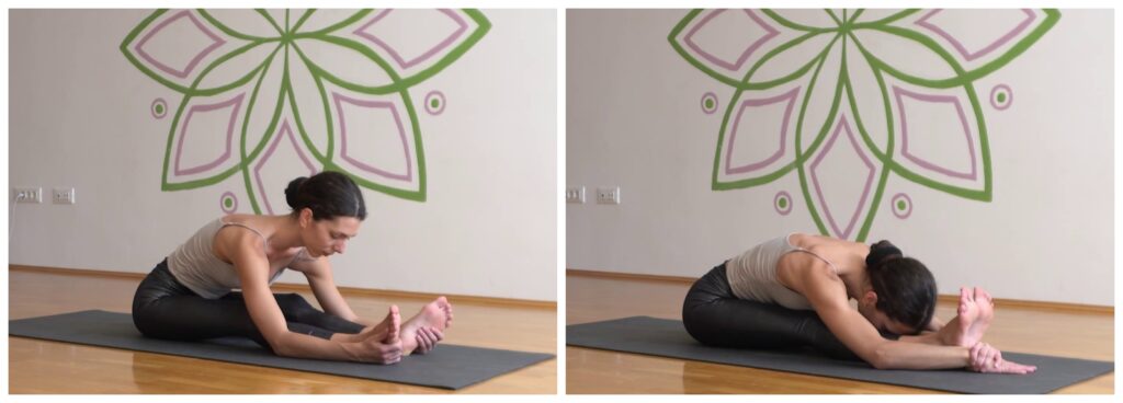 FORCING – we often focus on the final position or what is given, in this case, reaching the toes. Although we may be close to catching them, we should respect the process. By crossing the limits, we reach a state of tension and accelerated or even held breath, where the body will fail to relax deeper into the position. Patience and conscious breathing is the key to success.